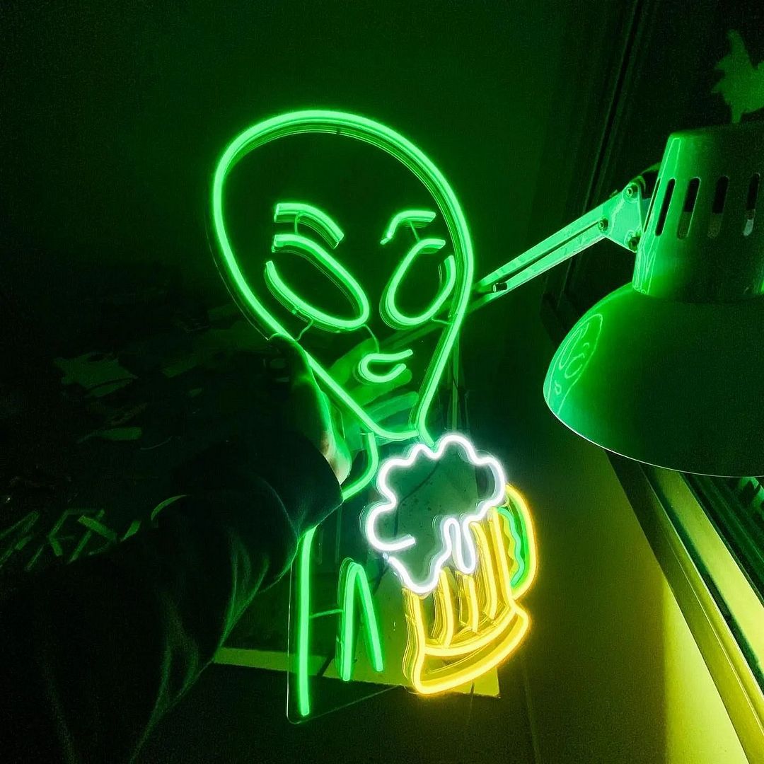 Bring some out-of-this-world fun to your space with our Alien Holding Beer Neon Sign. This quirky sign features an alien enjoying a cold brew, perfect for adding a touch of humor to your bar, man cave, or gaming room. Light up your decor with this playful and unique neon sign.