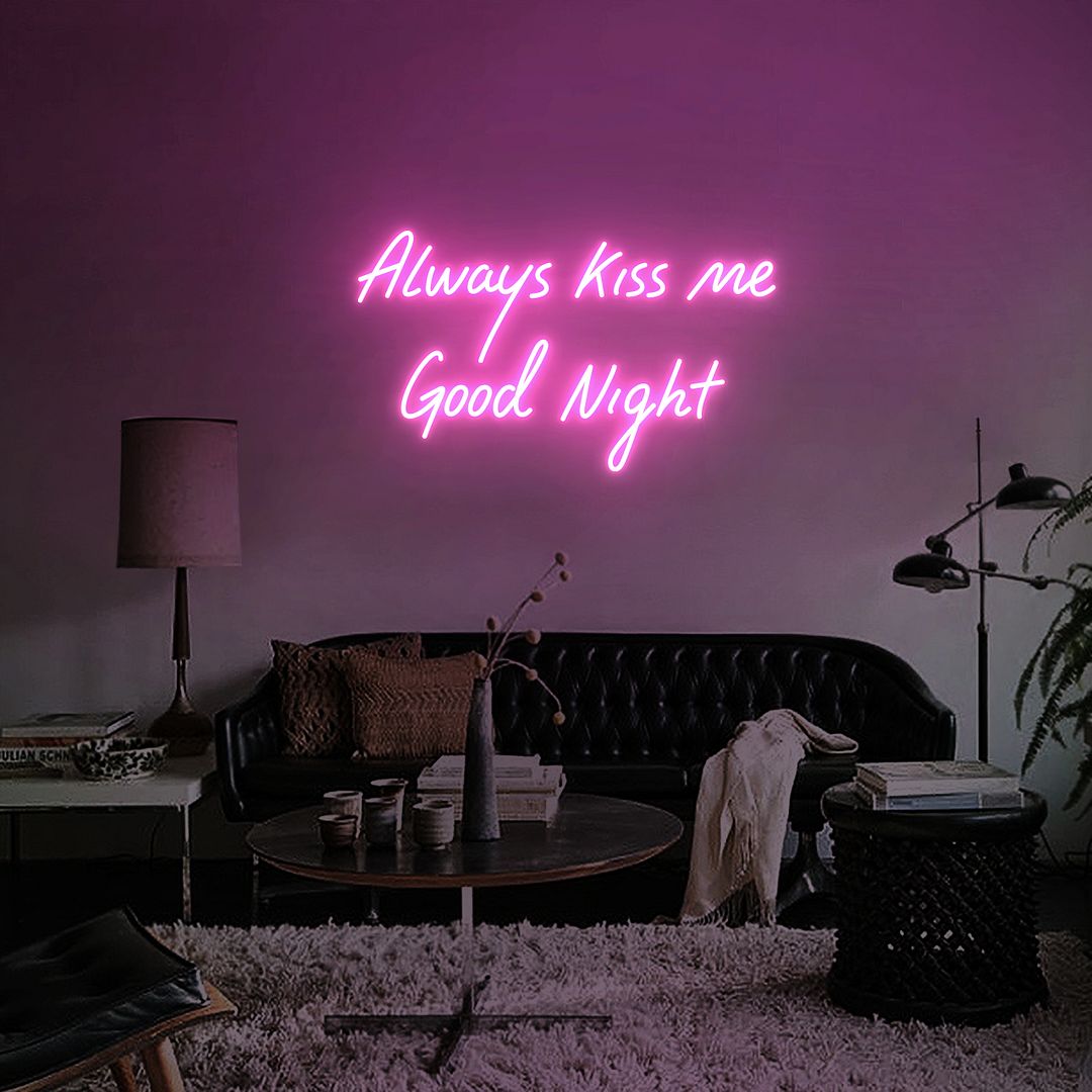 Transform your bedroom into a playful haven with the Always Kiss Me Goodnight Neon Sign. Its bright neon lights create a fun and flirtatious atmosphere. Perfect for any couple looking to add some whimsy to their space.