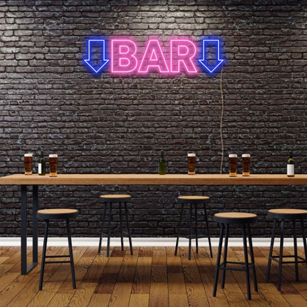 Get ready to light up your bar with the Bar Sign with Arrows Neon Sign! This fun and playful sign is the perfect addition to any bar or man cave. With its bright neon letters and arrows, it'll be sure to draw in customers and add a touch of humor to your space. Cheers to good vibes and good drinks!