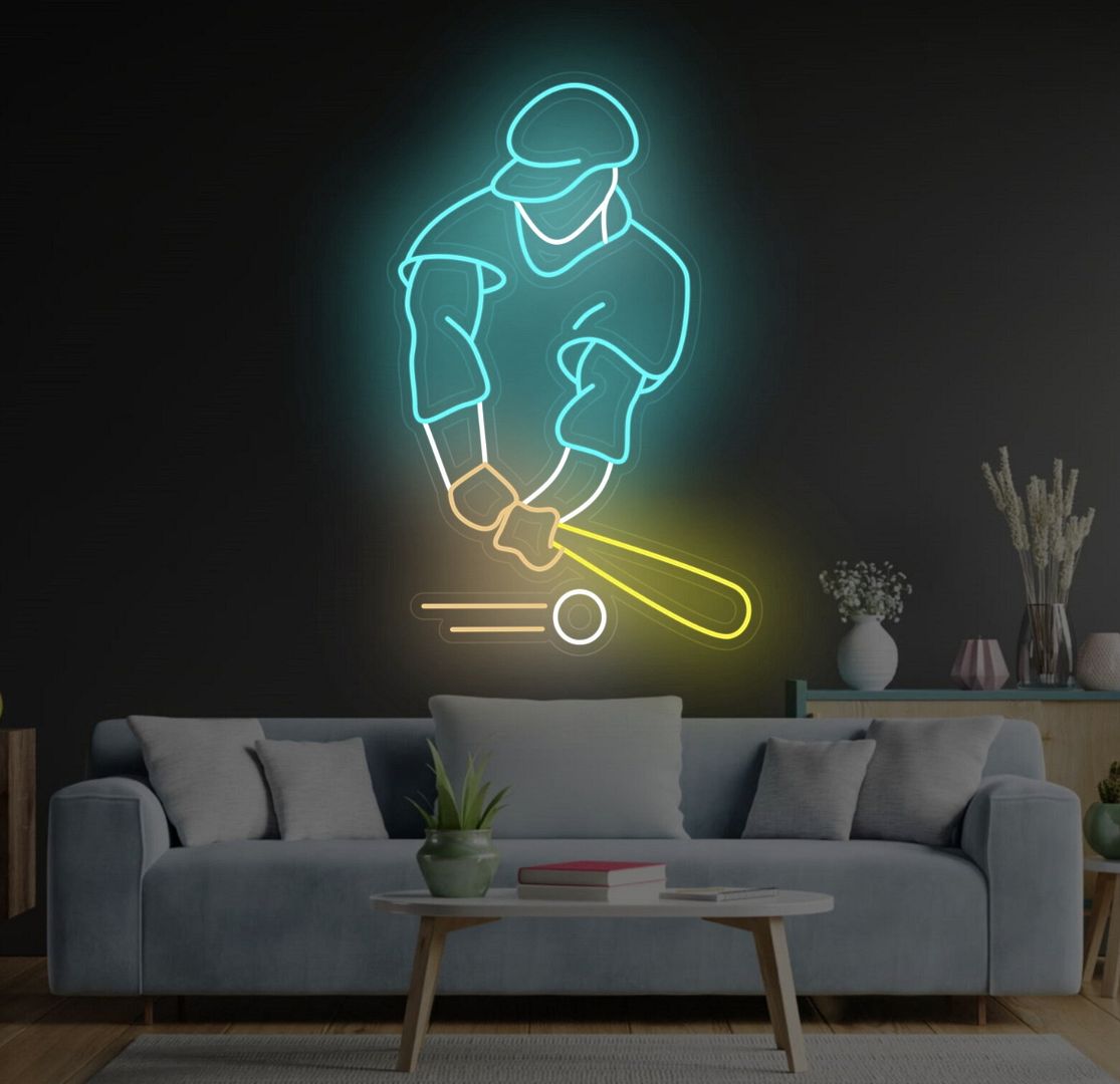 Score a home run with this neon sign featuring a baseball player! Perfect for adding a playful and quirky touch to any room or man cave. Show off your love for the game in a unique and eye-catching way. Batter up, grab this neon sign today!