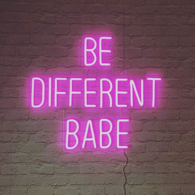 Stand out with the Be Different Babe Neon Sign! Shine bright and make a statement with this unique sign. Perfect for adding some personality to any room. Be bold and choose to be different with this neon sign.