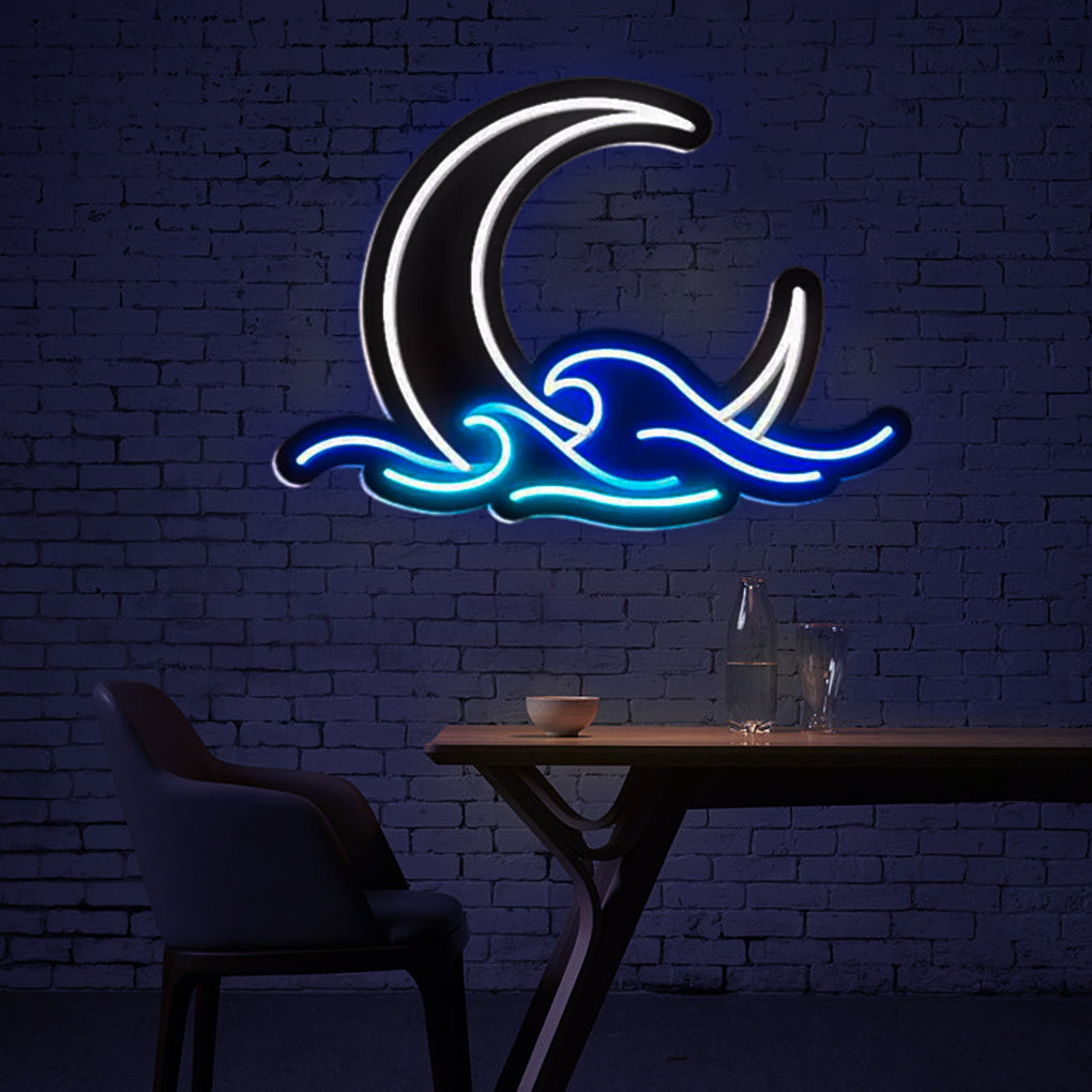 Light up your space with the whimsical Moon And Wave LED Neon Sign. This playful addition adds a touch of magic with its lunar and ocean waves design. Perfect for a quirky and fun atmosphere, it's sure to be a conversation starter.