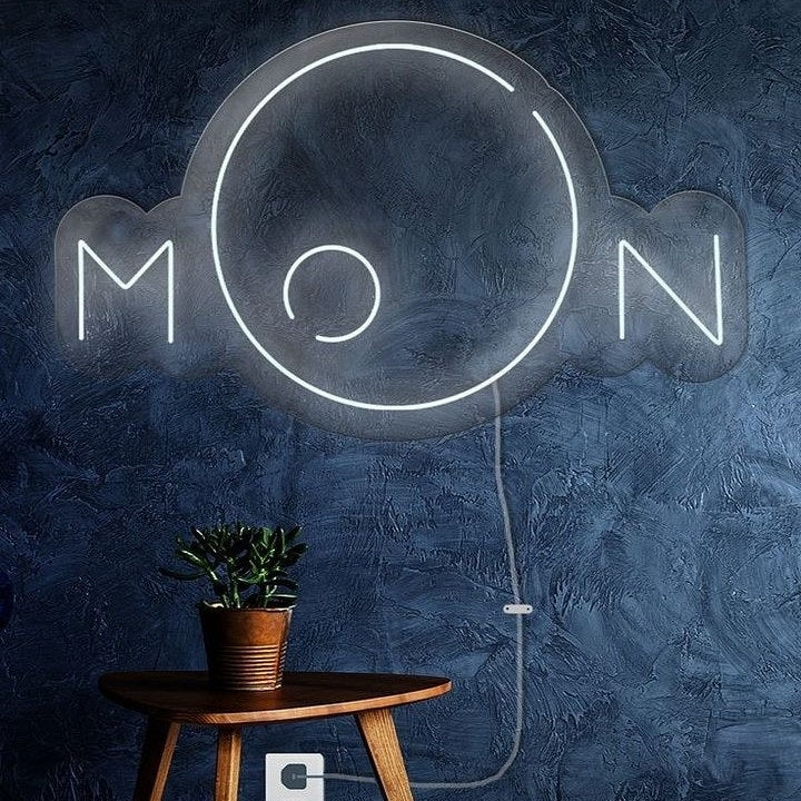 Light up your space with the Moon Neon Sign. This quirky and playful sign will add a touch of fun and whimsy to any room. Perfect for parties, dorm rooms, or a unique home decor piece. Shine bright like the Moon (Neon Sign)!
